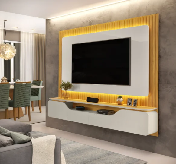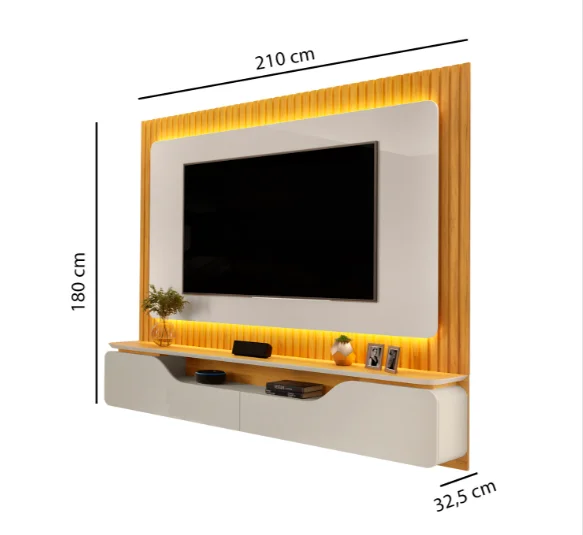 Com estrutura robusta e excelente acabamento, o painel destaca a TV como ponto central do ambiente, proporcionando harmonia entre decoração e funcionalidade. A prateleira integrada oferece espaço ideal para aparelhos eletrônicos e objetos decorativos, enquanto o LED embutido adiciona charme e conforto visual ao espaço.